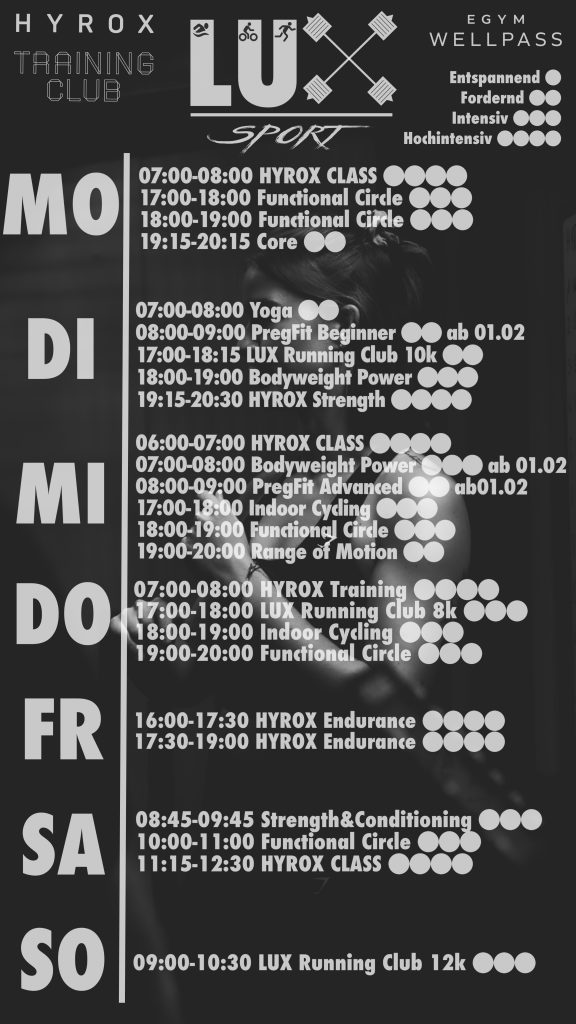 Willkommen bei Lux Sport, deinem spezialisierten HYBRID Studio für effektives Training, funktionelle Fitness und ganzheitliche Bewegung. Als ein ganzheitliches Studio bieten wir dir ein vielseitiges Kursangebot, das auf Kraft, Ausdauer, Mobilität und Athletik ausgerichtet ist – perfekt für alle, die sich sportlich weiterentwickeln und an ihre Grenzen gehen wollen.